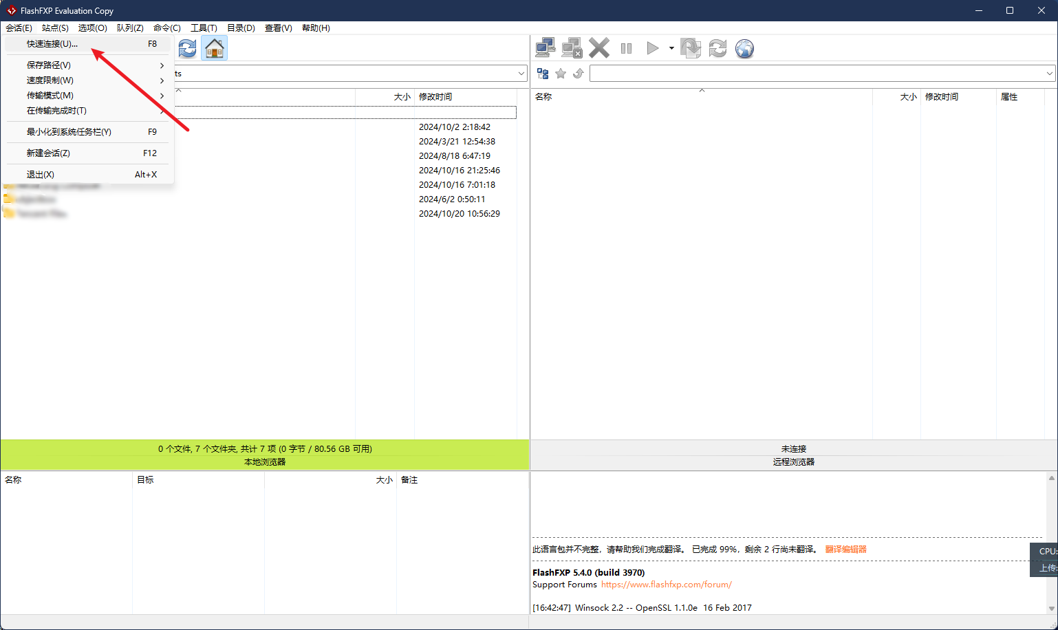 然后下载 flashfxp,打开点右上角的会话 - 快速连接